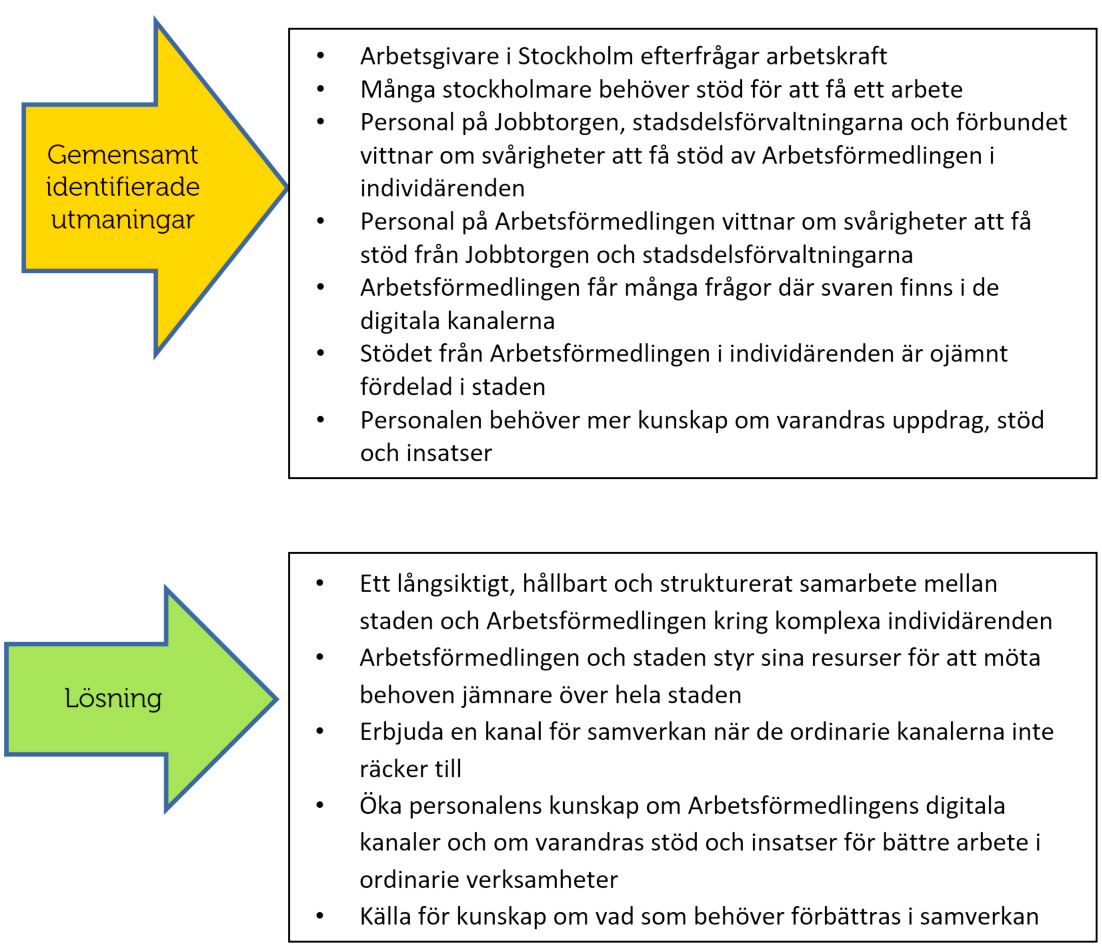 Samordningsförbundet Stockholms stad och medlemmarna arbetar kontinuerligt med att utveckla samverkan kring stockholmarna i behov av samordnat stöd från flera aktörer. Det är många aktörer involverade med olika lagstiftning och uppdrag, vars förutsättningar snabbt kan förändras utifrån politiska beslut. Förstudien Parallella spår (2021), med finansiering från Europeiska socialfonden, beskriver några utmaningar för samverkan och ger förslag på lösningar. Ett av förslagen var Förstärkt kontaktväg till Arbetsförmedlingen som senare resulterade i Kommunhubben.