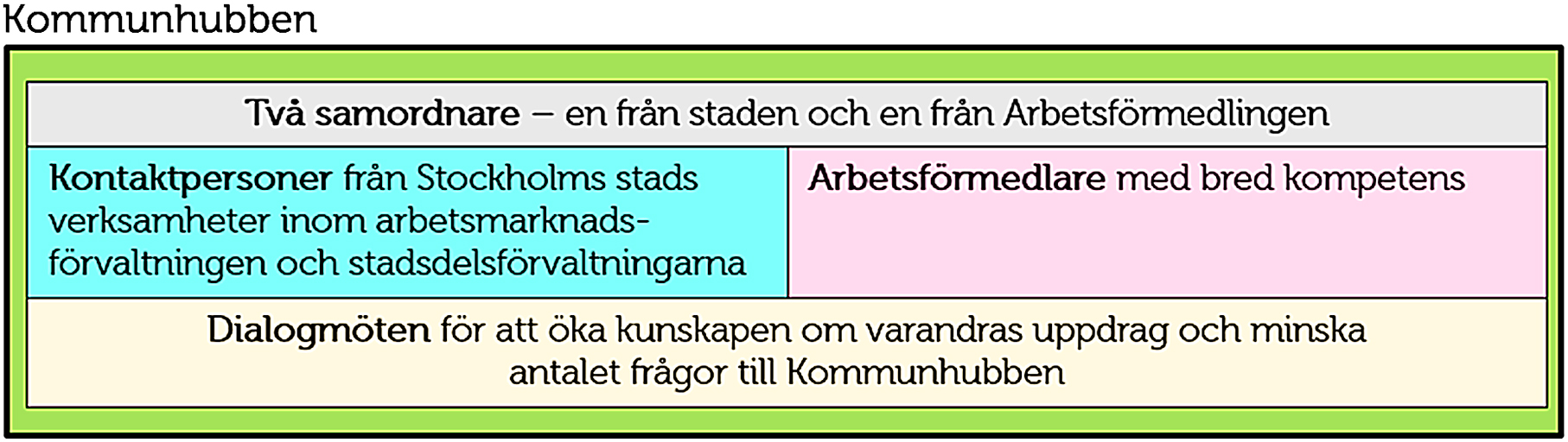 Kommunhubben startade i april 2023 och är en gemensam satsning mellan Arbetsförmedlingen och Stockholms stad. Kommunhubben bemannas med arbetsförmedlare från Arbetsförmedlingen och kontaktpersoner från staden. Syftet är att ge lika stöd över hela staden i individärenden där de ordinarie kanalerna inte räcker till. Kommunhubben utvecklas succesivt och är en viktig källa för information om vad som behöver förbättras i samverkan.